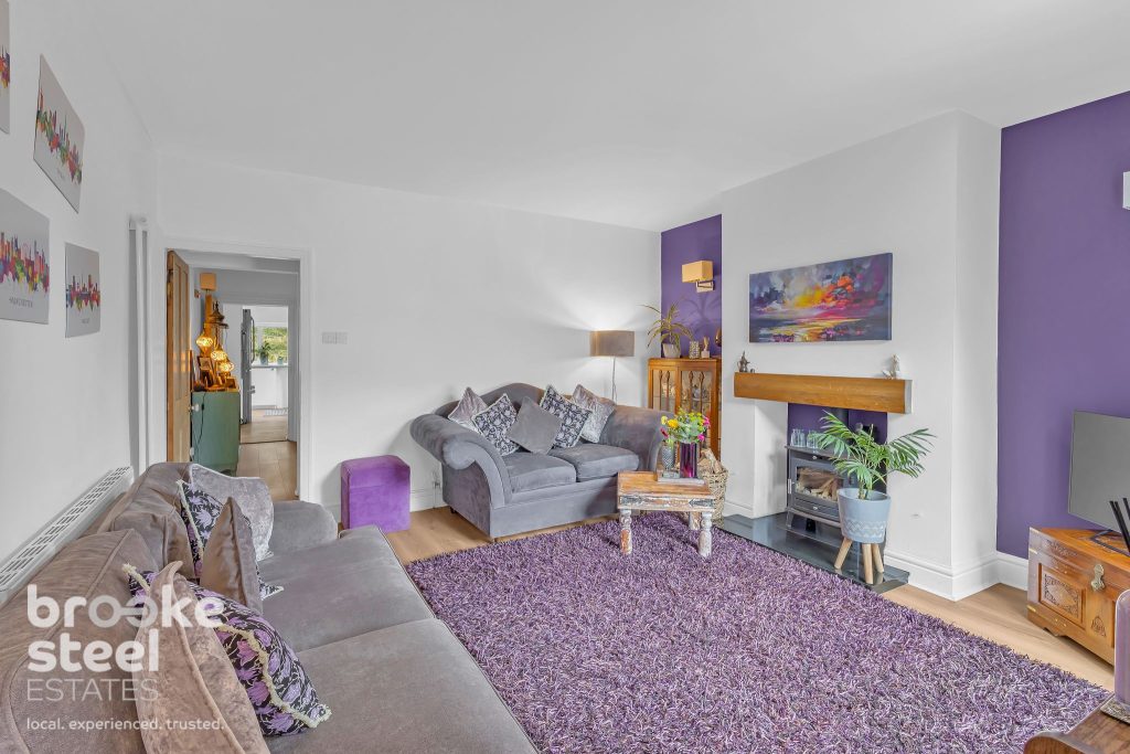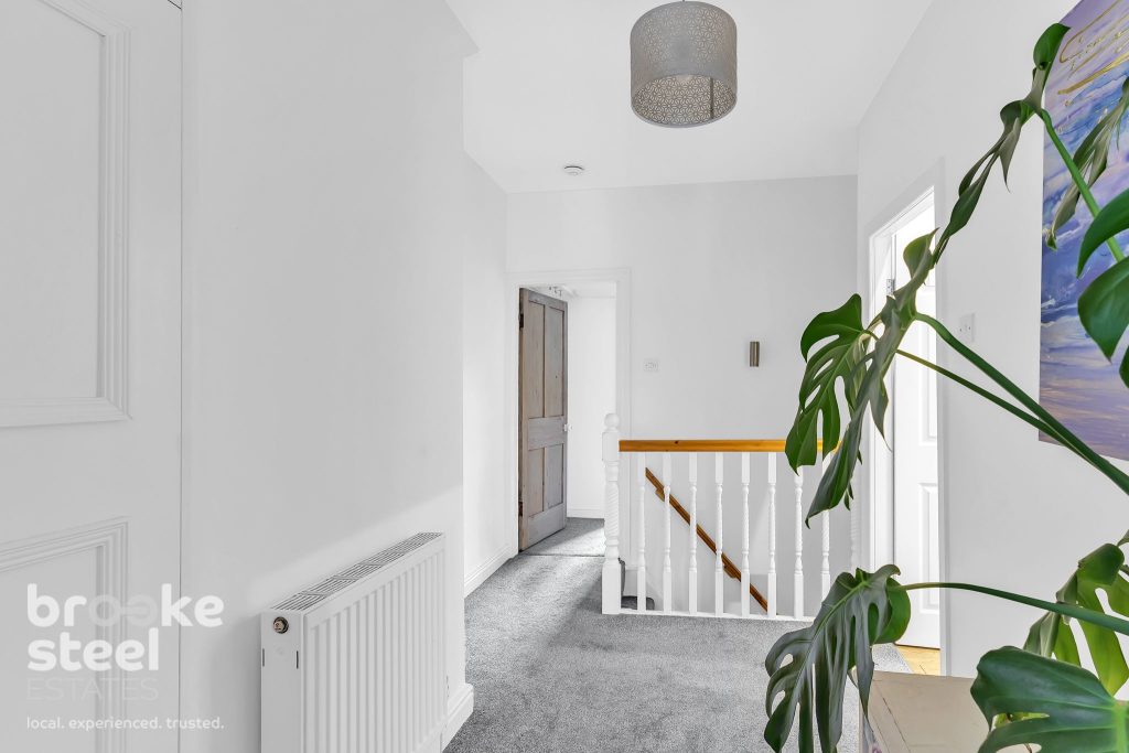 Upstairs, the generous landing area provides built-in storage and a peaceful retreat with views from the rear window. The main bedroom is spacious and airy, with windows on two sides with modern white substantial wardrobes. The second bedroom offers a cosy haven with its own dual aspect views. The luxurious bathroom includes a quadrant shower, a freestanding bath with a waterfall tap, a wall-mounted vanity basin, and a built-in linen cupboard housing washing machine, all complemented by white oak Karndean flooring and stylish tiled elevations.