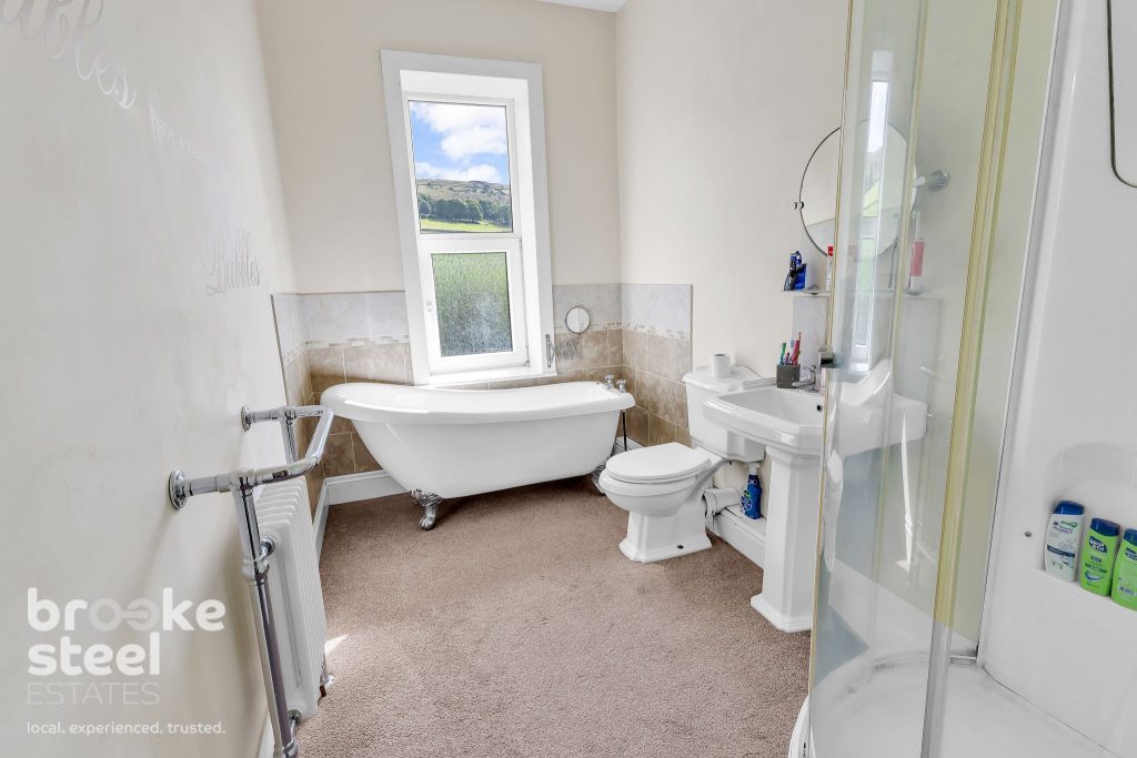 UPVC double glazed half frosted window, central heating radiator, low flush WC, pedestal wash basin with traditional taps, freestanding roll top ball and claw slipper bath with mixer tap and rinse head, multi jet shower in corner enclosure and extractor fan.