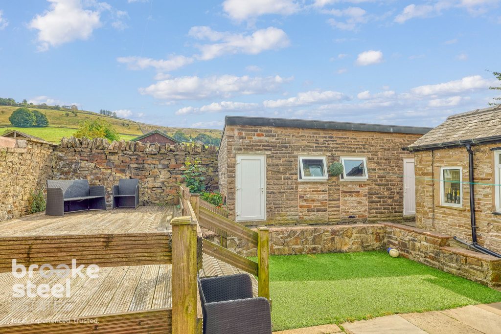 Enclosed rear garden with paving, artificial lawn, decking, garage access, two storage sheds and boiler room.