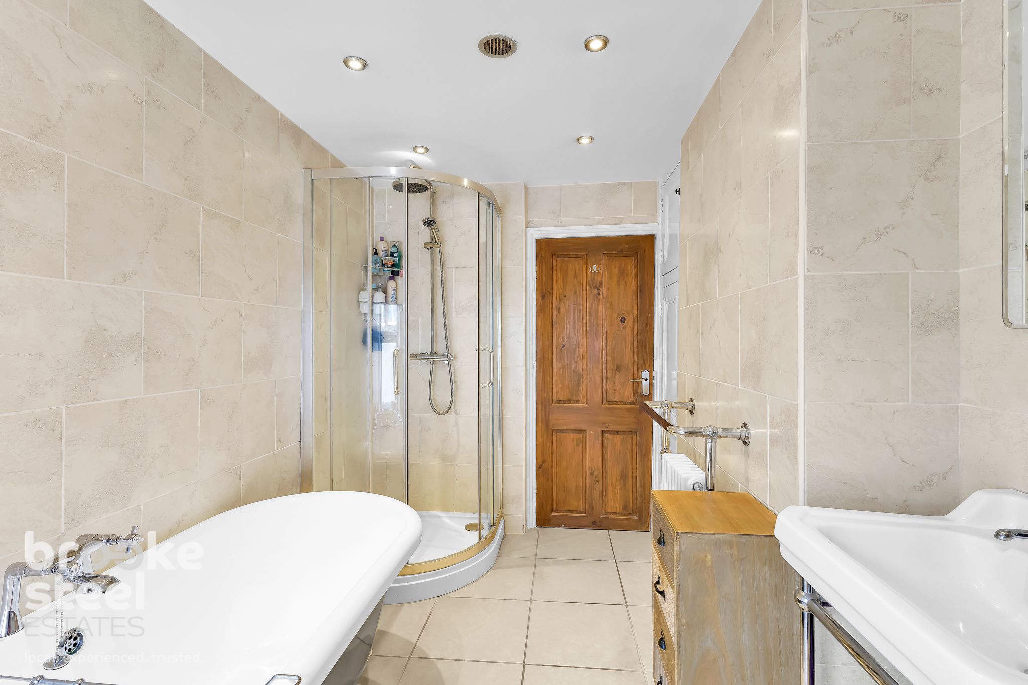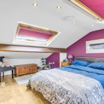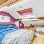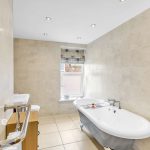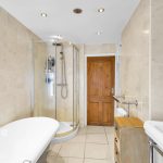 The bathroom is equally impressive, boasting a four-piece suite, complete with a roll-top bath, creating a luxurious space for relaxation.