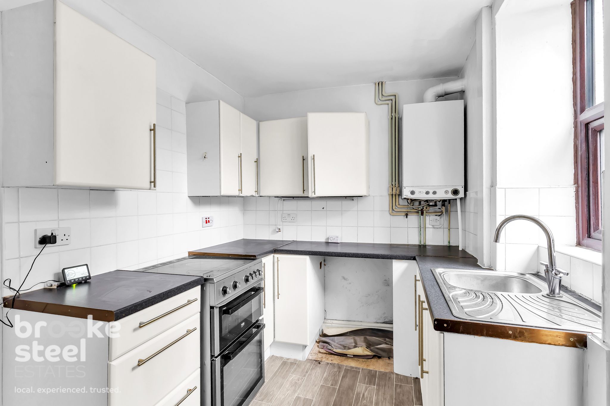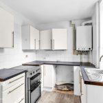 The ground floor features a living area that connects to a kitchen space fitted with white wall and base units. The bedroom is of a good size with two windows to front aspect, and the shower room is functional with walk in shower.