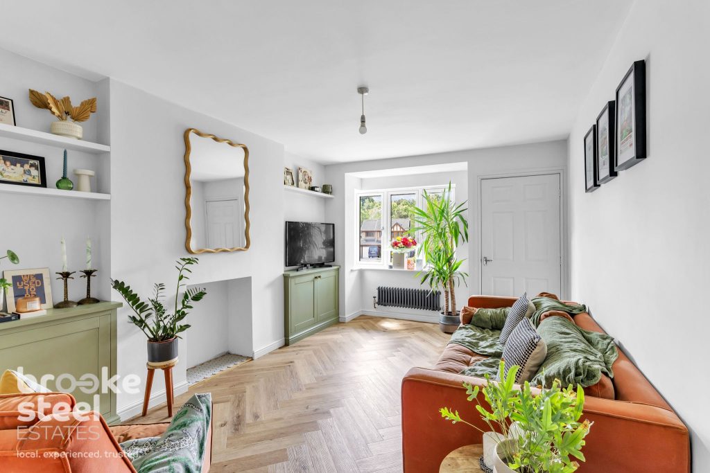 Reception Room : UPVC double glazed window, wall mounted gas central heating radiator, integrated alcove storage, wood effect parquet flooring and ceiling light. Door to internal hallway.
