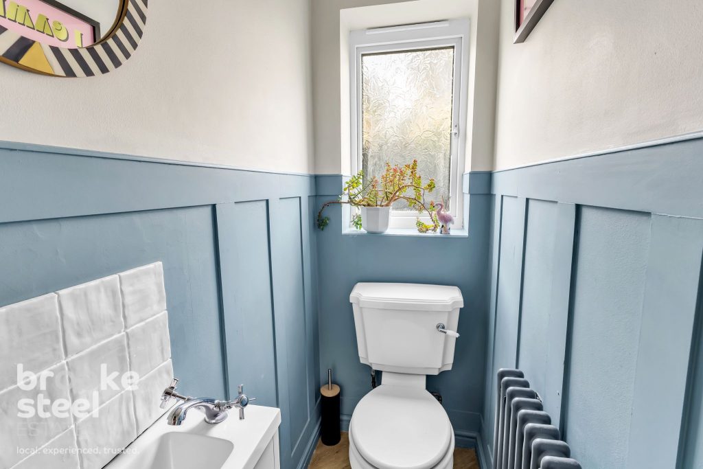 Downstairs WC : Double glazed frosted window, wall mounted gas central heating radiator, ceiling light, low level WC, vanity top wash basin with mixer tap and wood effect parquet flooring.