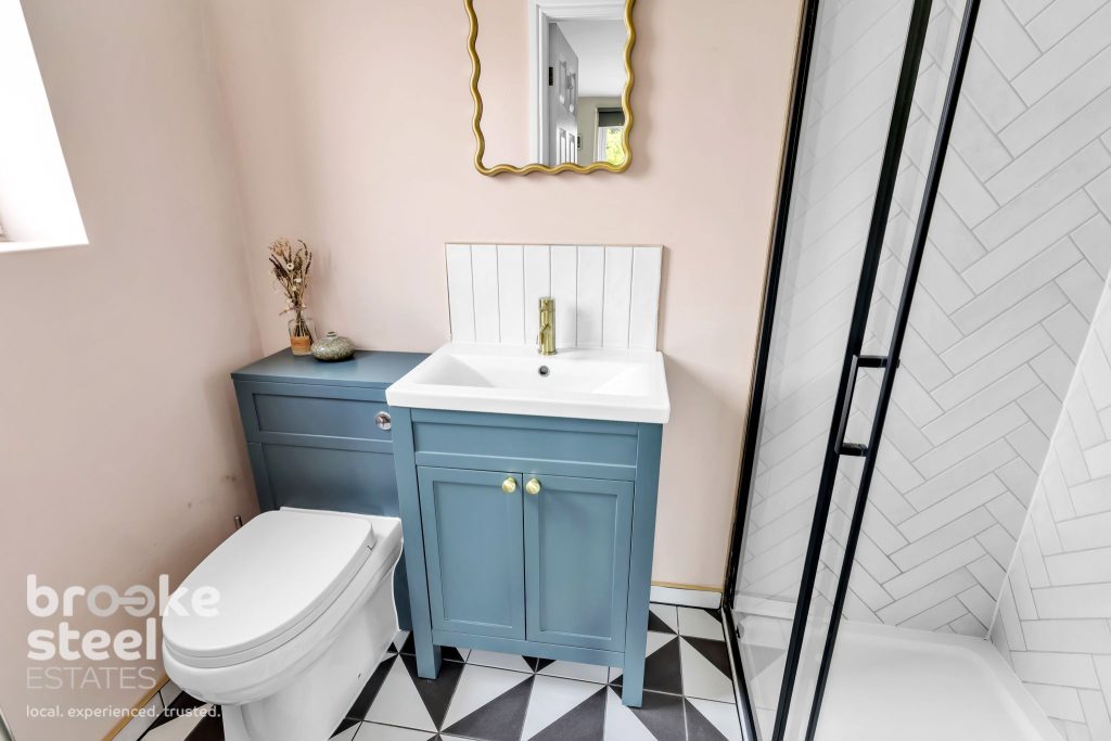 En-Suite Shower Room : UPVC double glazed frosted window and wall mounted central heated towel rail. Three piece suite compromising of dual flush WC, vanity top wash basin with mixer tap, direct feed rainfall shower enclosed. Spotlights and laminate flooring.