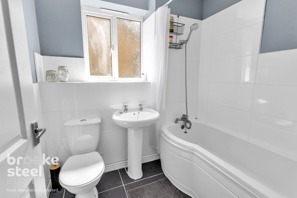 Bathroom : UPVC double glazed frosted window, ceiling light and wall mounted gas central heating radiator. Three piece suite including dual flush WC, pedestal wash basin with traditional taps, p-shaped panel bath with mixer tap and rinse head. With part tiled and tiled flooring.