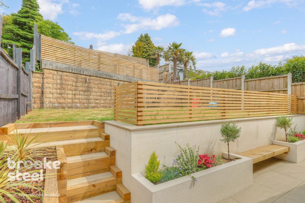 Enclosed multi-level garden with decking, bedding areas and laid to lawn.