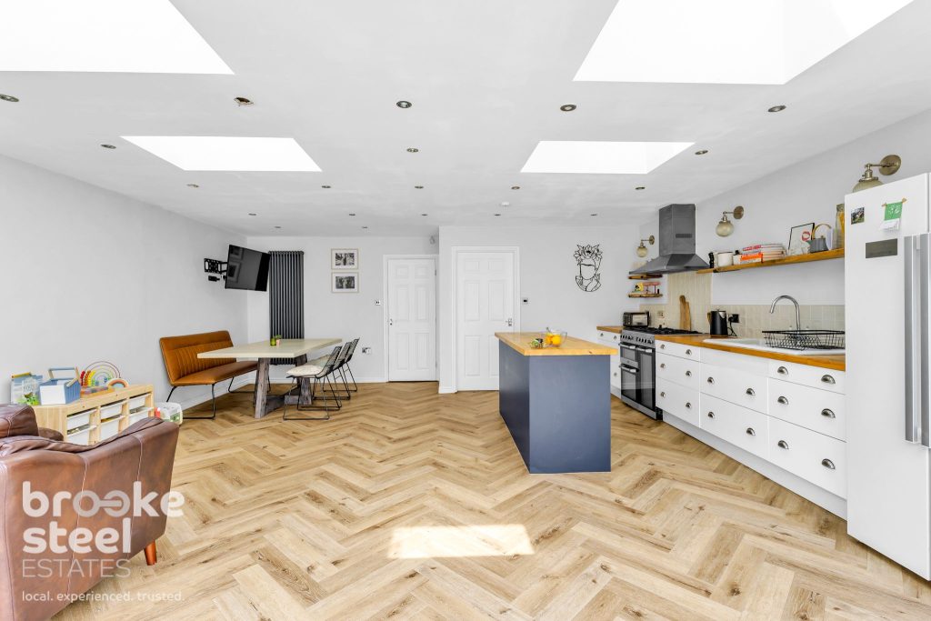 Open Plan Kitchen/Dining Area : The heart of this home is this space for entertaining and dining. With four velux windows, wall mounted gas central heating radiator, mix of gloss wall and base units with wooden worktops over, kitchen island, cuisine master oven with five ring gas hobs and extractor hood. Tiled splashbacks, ceramic one and a half bowl sink and drainer with mixer tap over. Space for refrigerator, spotlights and wood effect parquet flooring. Door to utility and UPVC double glazed bi-folding doors to rear.