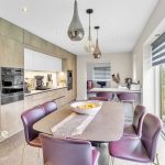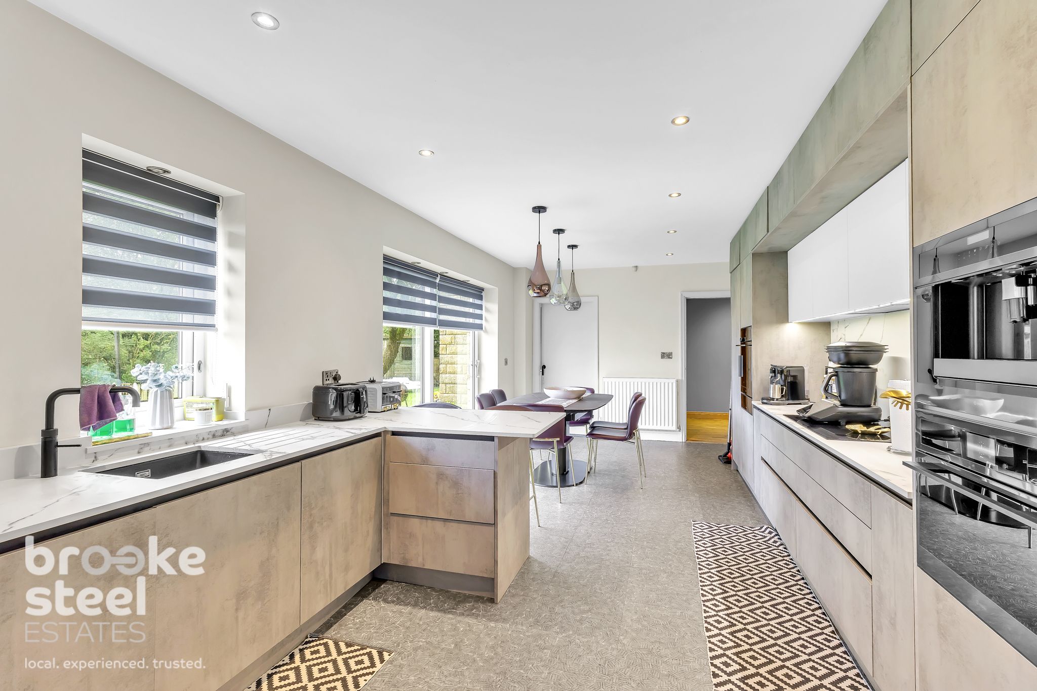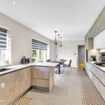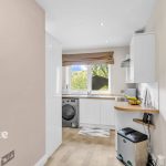 The heart of the home is a stunning open-plan kitchen-dining area featuring premium appliances, including a six-ring induction hob, eye-level oven, microwave, steam oven, built-in coffee machine, full-height fridge and freezer, and an integrated dishwasher. Quartz worktops and Karndean Michelangelo flooring, fitted in 2022, complement the sleek and modern aesthetic. The addition of a Quooker quad-tap provides instant boiling, chilled, and sparkling water. A separate utility room with a charming split stable door adds further practicality.